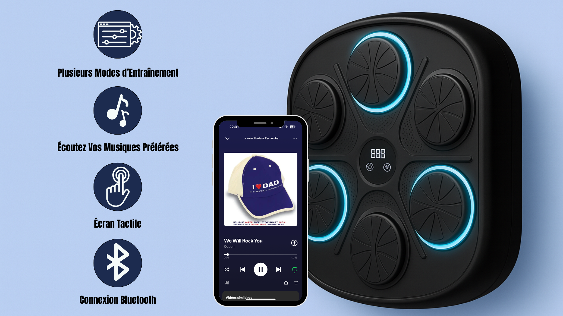 Lumières LED interactives : guident les enchaînements pour améliorer réflexes, coordination et vitesse de frappe.